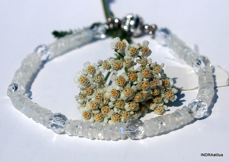 A karkötő holdkőből, hegyikristályból és allergiamentes fém alkatrészekből áll.