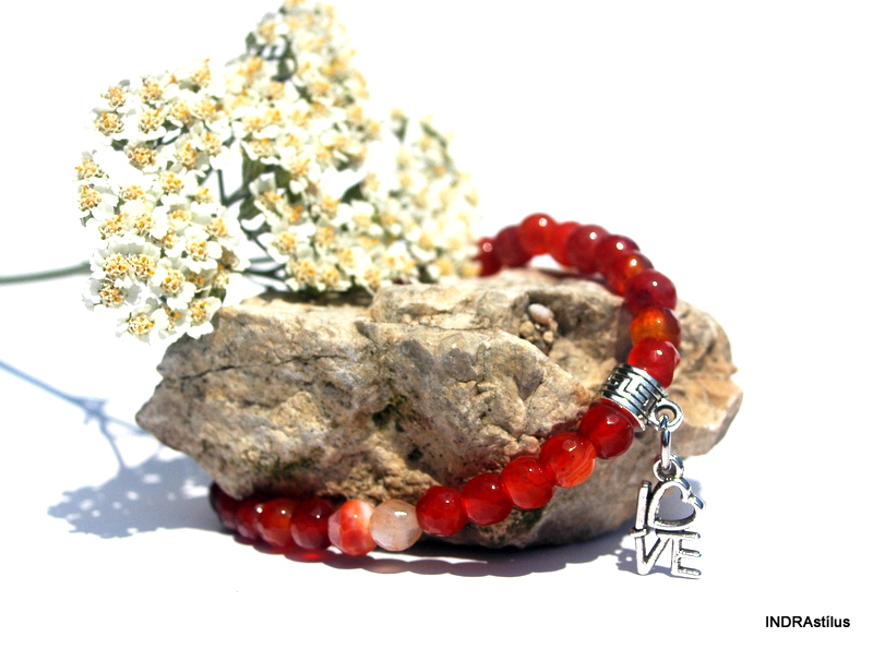 A karkötő minőségi alapanyagokból: vörös jáspisból készült, allergiamentes fém alkatrészeket tartalmaz: love feliratú medál