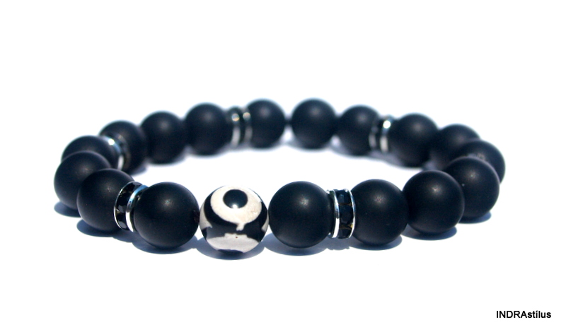A karkötő minőségi alapanyagból készült: dzi szem, ónix kövek remek harmóniája, és allergiamentes fém alkatrészeket tartalmaz.